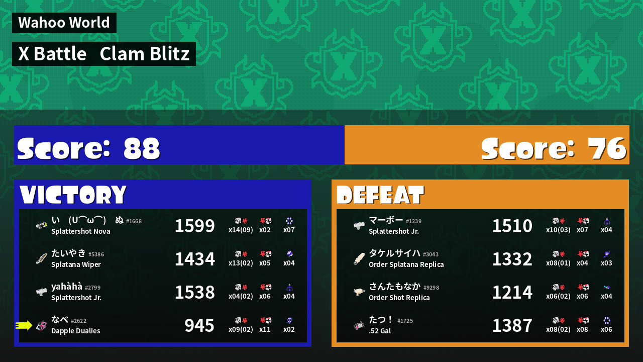 | Medals | #1 Tacticooler User #2 Super Jump Spot #2 Enemy Splatter | ||