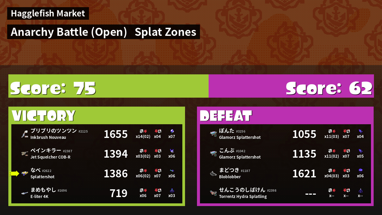 | Mode | Splat Zones - Anarchy Battle (Open) |
