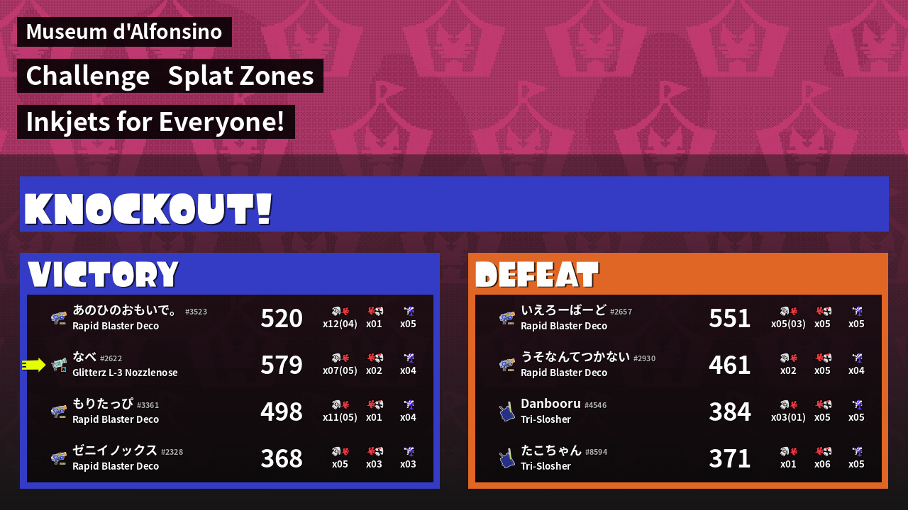 | Medals | #1 Splat Zone Inker #1 Turf Inker #1 Super Jump Spot |