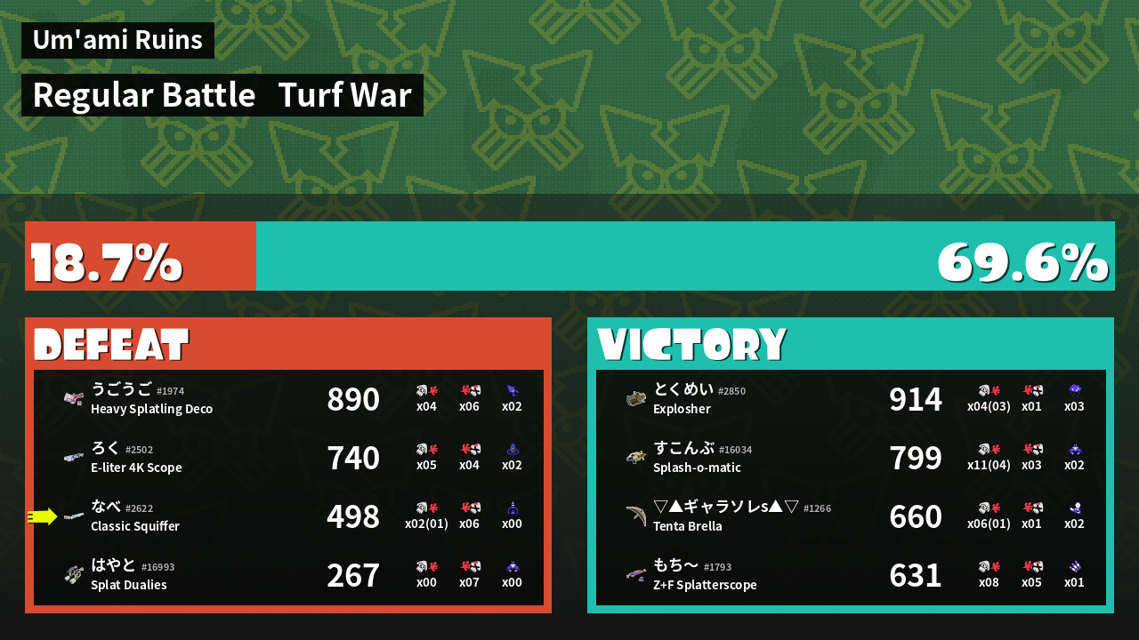 | Medals | #1 Popular Target #1 Splat Assister #1 Ground Traveler | ||