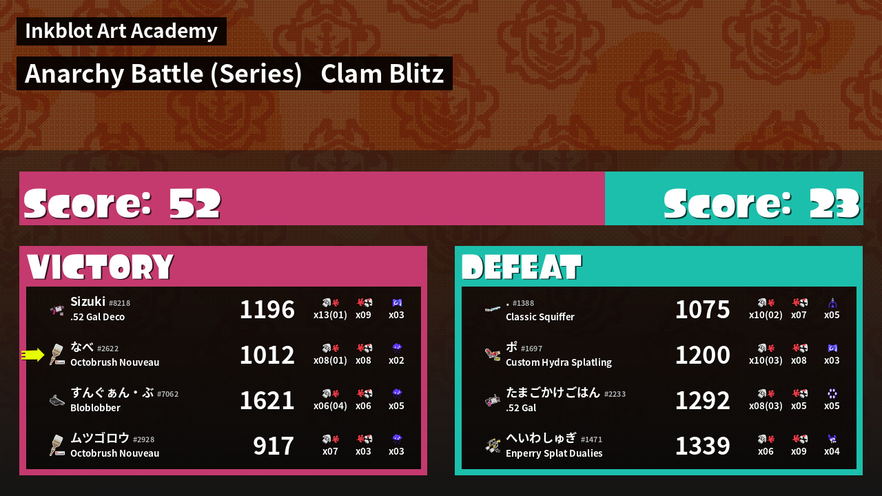 | Medals | #1 Clam Carrier #1 Popular Target #2 Overall Splatter | ||