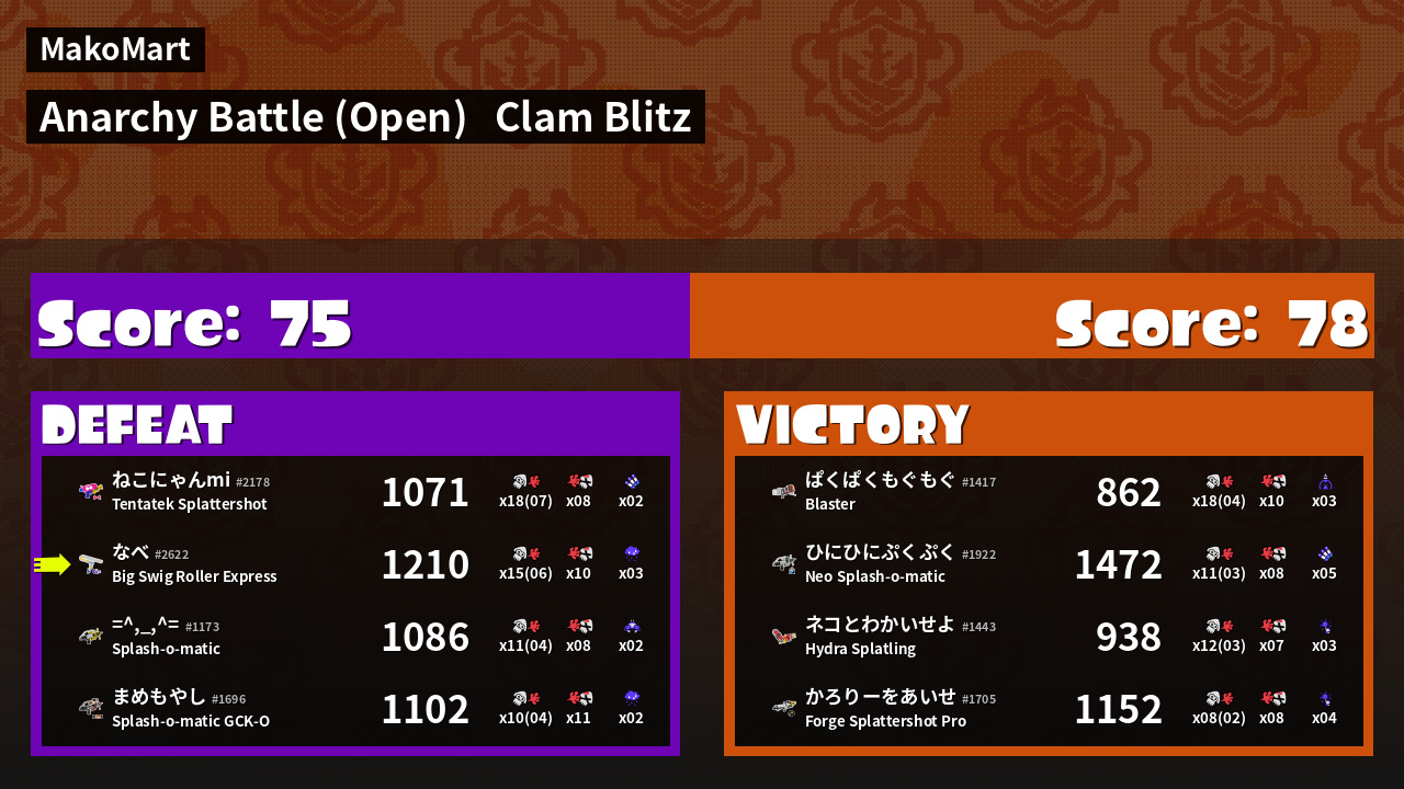 | Mode | Clam Blitz - Anarchy Battle (Open) |