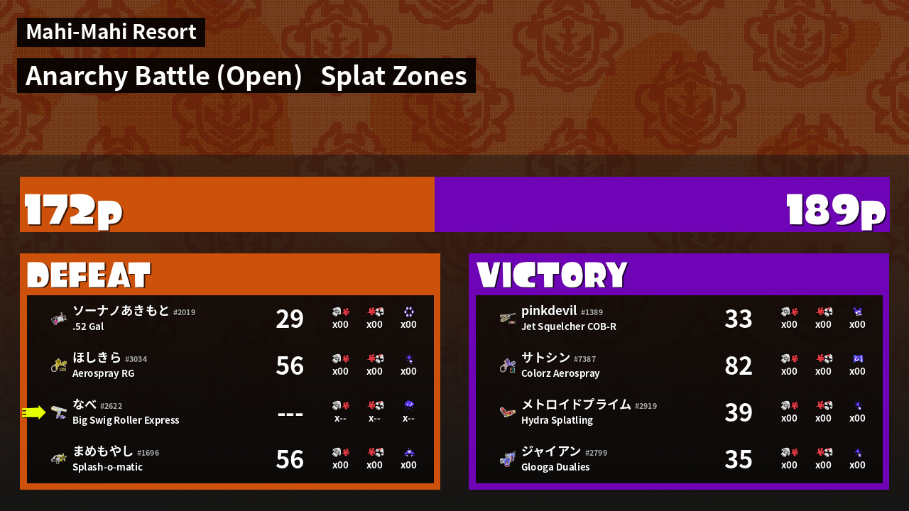 | Mode | Splat Zones - Anarchy Battle (Open) |