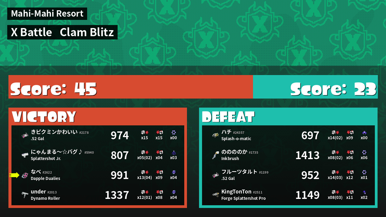 | Medals | #1 Splat Assister #1 Tacticooler User #2 Overall Splatter | ||