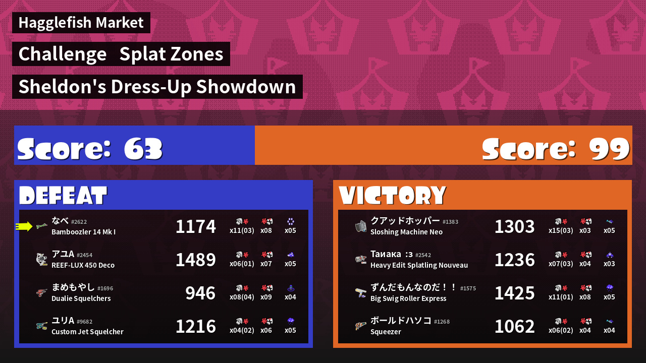 | Medals | #1 Overall Splatter #1 Splat Zone Guard #1 Popular Target | ||