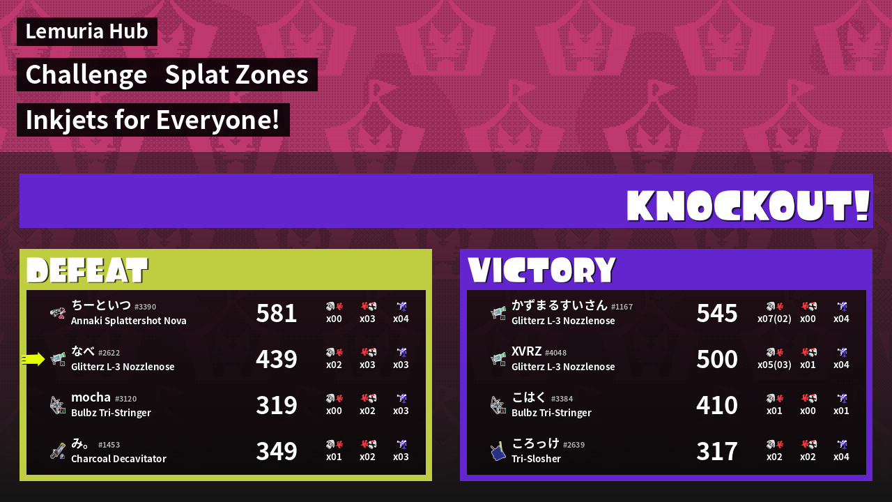 | Weapon | Glitterz L-3 Nozzlenose ( Splat Bomb / Inkjet) |