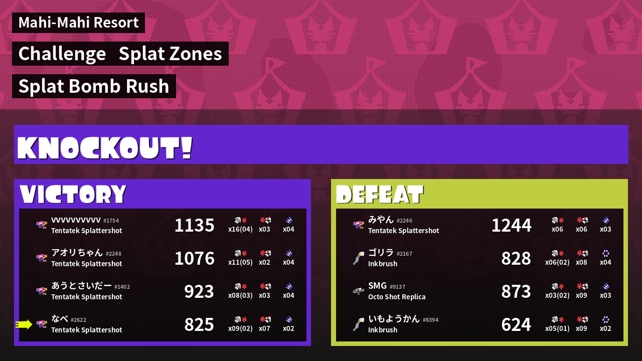 | Challenge | Splat Bomb Rush Let the Splat Bombs fly in this free-for-all! | ||