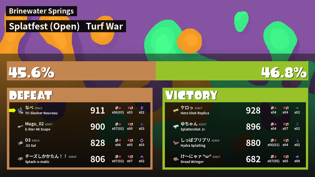 | Medals | #1 Turf Inker #1 Enemy-Base Inker #1 Splat Assister | ||