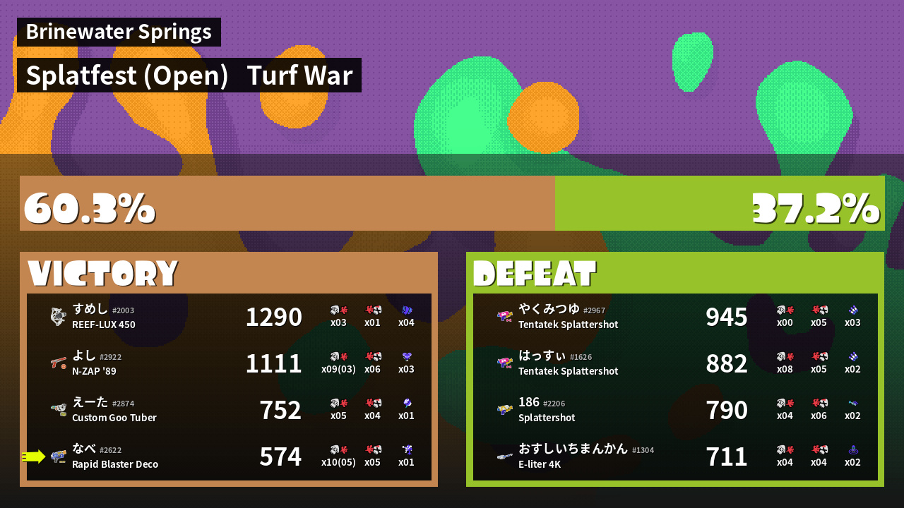 | Medals | #1 Overall Splatter #1 Splat Assister #1 Damage Taker | ||