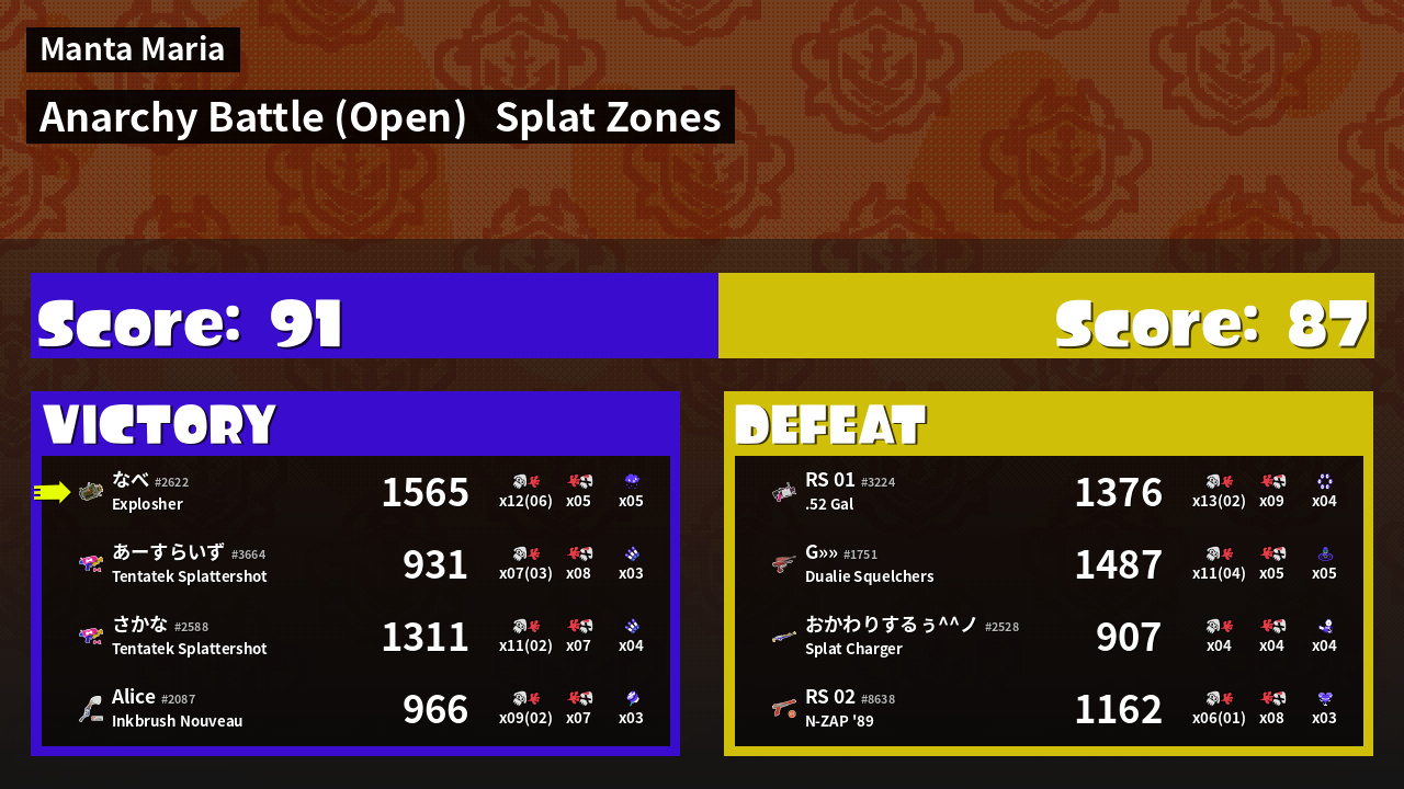 | Mode | Splat Zones - Anarchy Battle (Open) | ||