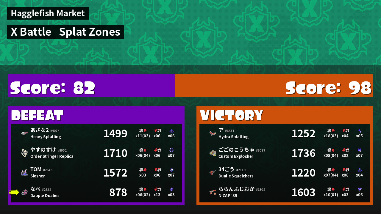 | Medals | #1 Splat Zone Hero #1 Ground Traveler #1 Tacticooler User | ||