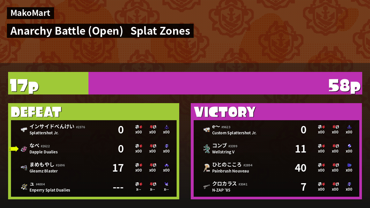 | Mode | Splat Zones - Anarchy Battle (Open) |