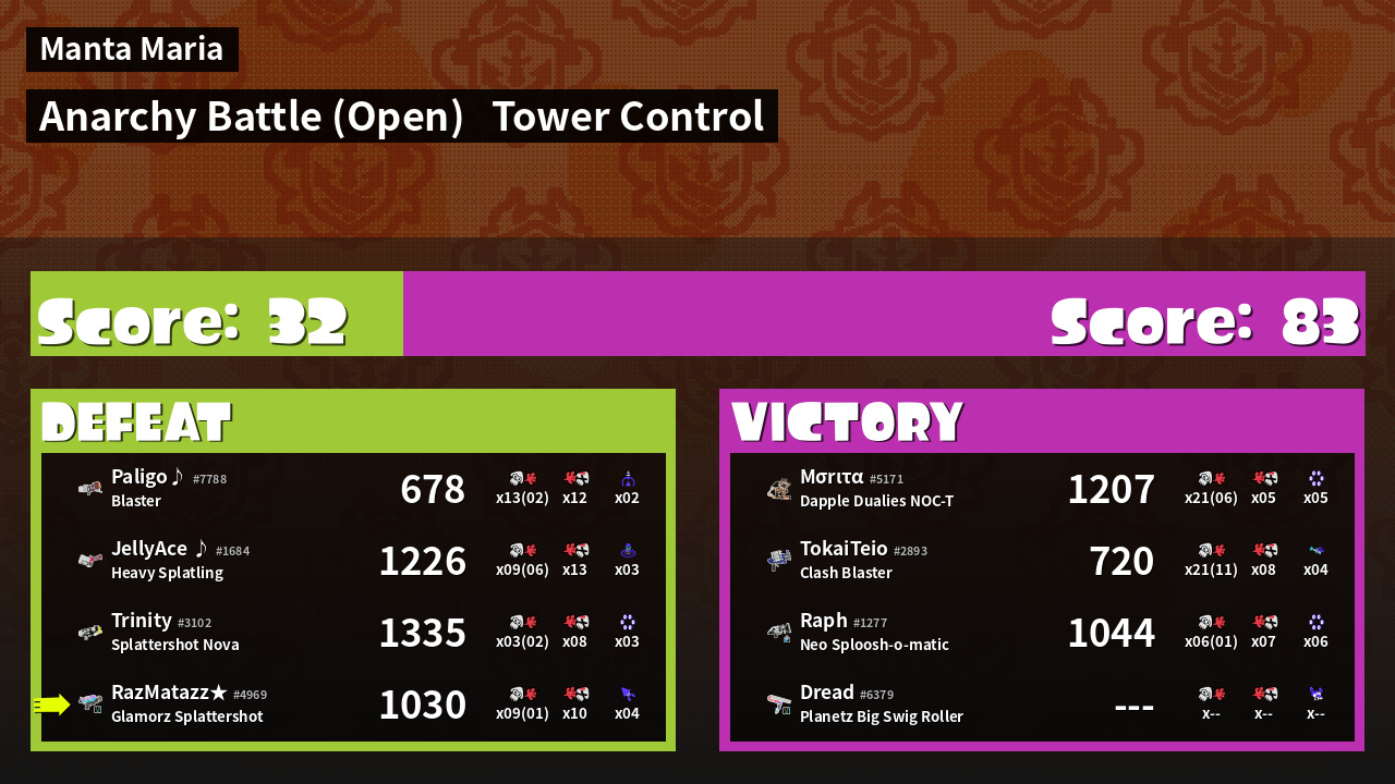 | Medals | #1 Ground Traveler #1 Kraken Royale User #2 Overall Splatter |