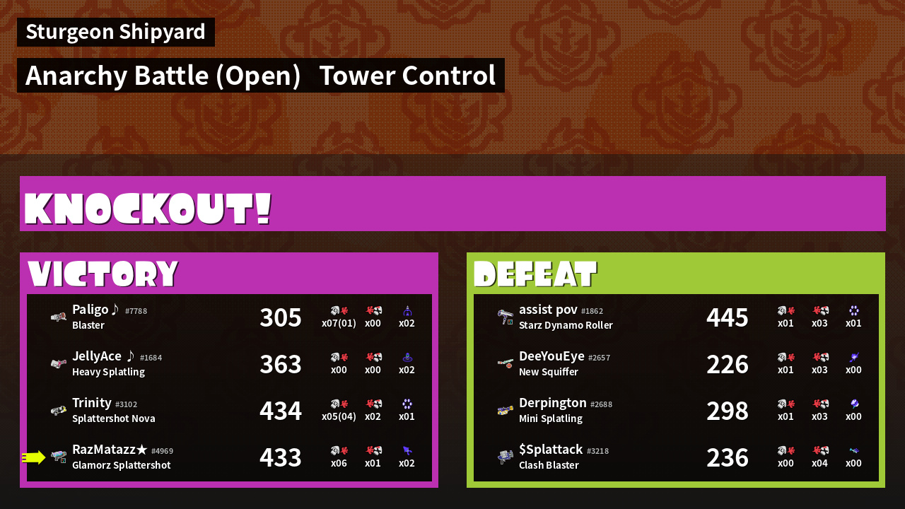 | Weapon | Glamorz Splattershot ( Burst Bomb / Kraken Royale) |