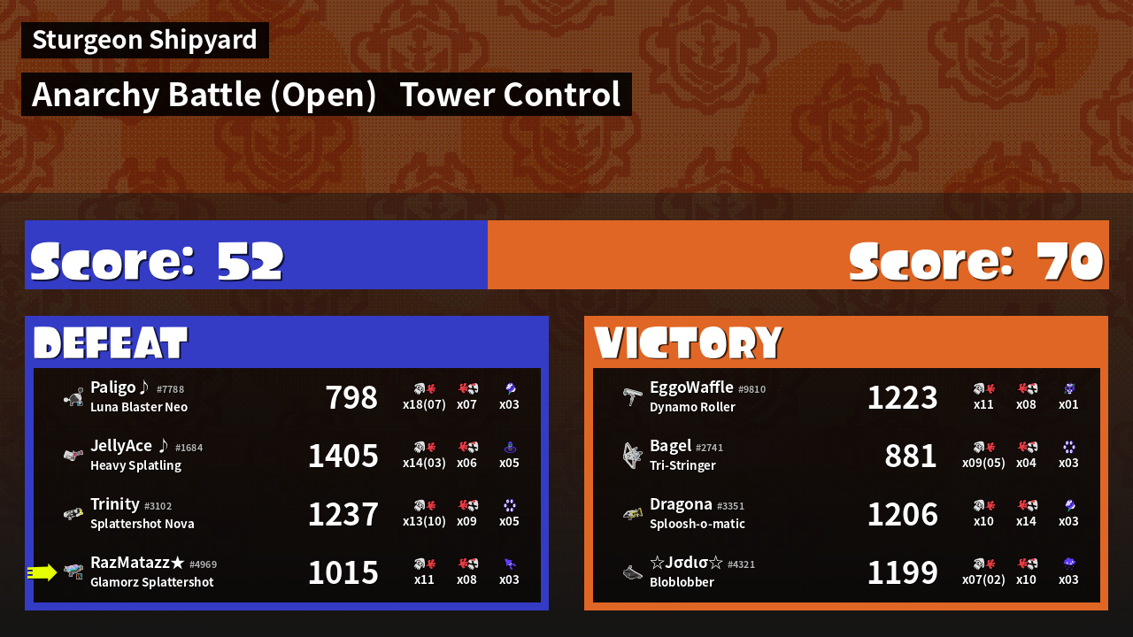 | Weapon | Glamorz Splattershot ( Burst Bomb / Kraken Royale) |