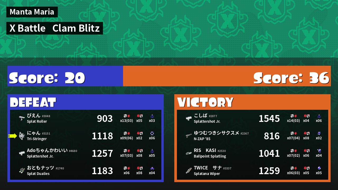 | Medals | #1 Clam Carrier #1 Super Jump Spot #1 Splat Assister | ||