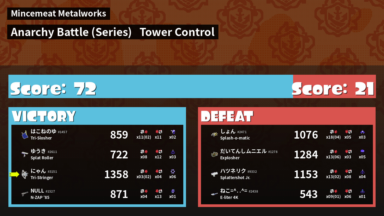 | Medals | #1 Turf Inker #1 Splat Assister #1 Killer Wail 5.1 User | ||