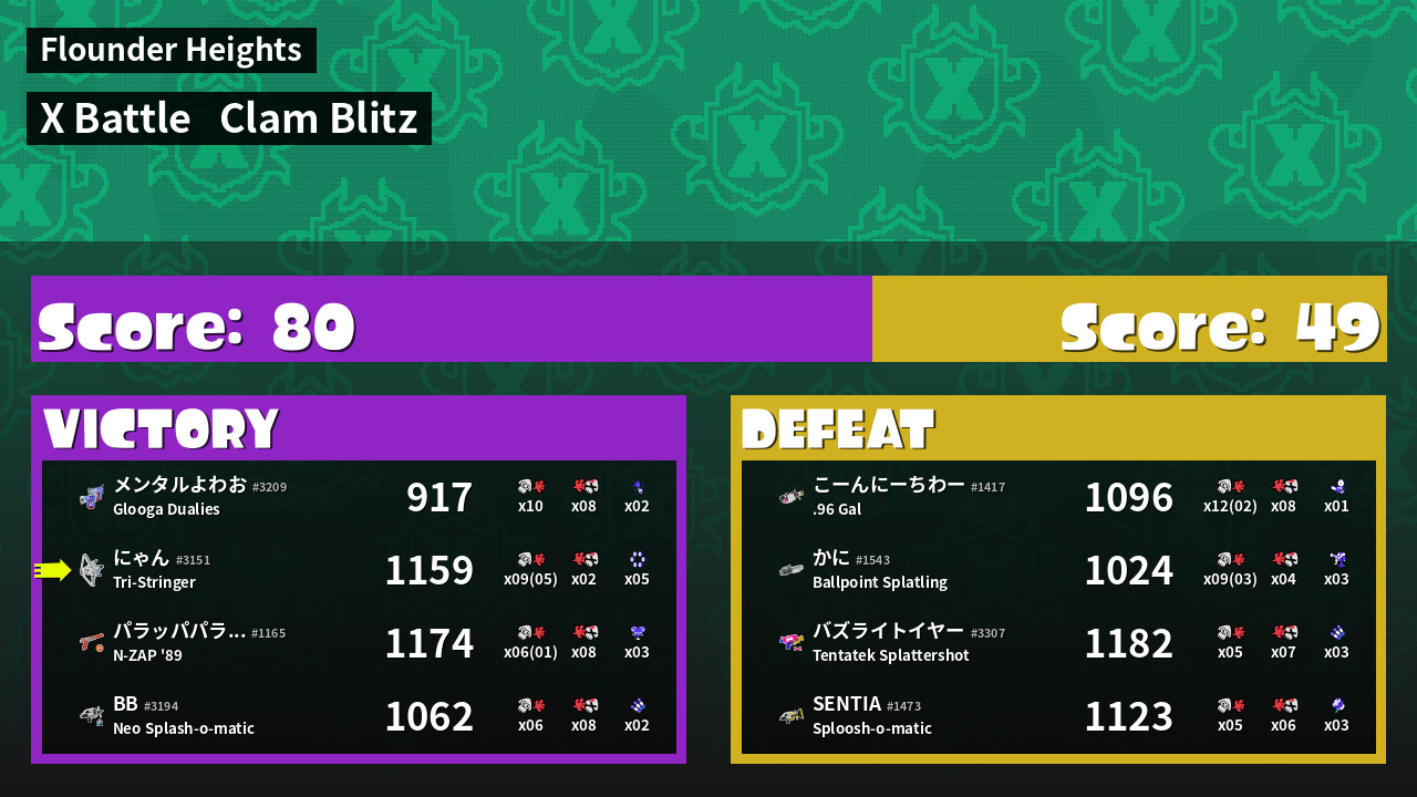| Medals | #1 Super Jump Spot #1 Splat Assister #1 Clam Stopper | ||