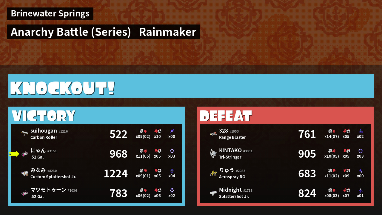 | Medals | #1 Overall Splatter #1 Splat Assister #1 Ground Traveler | ||