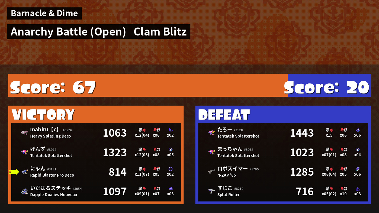| Medals | #1 Super Jump Spot #1 Splat Assister #1 Clam Stopper | ||