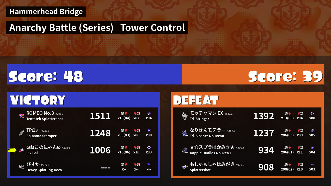 | Medals | #1 Overall Splatter #1 Splat Assister #1 Damage Taker | ||