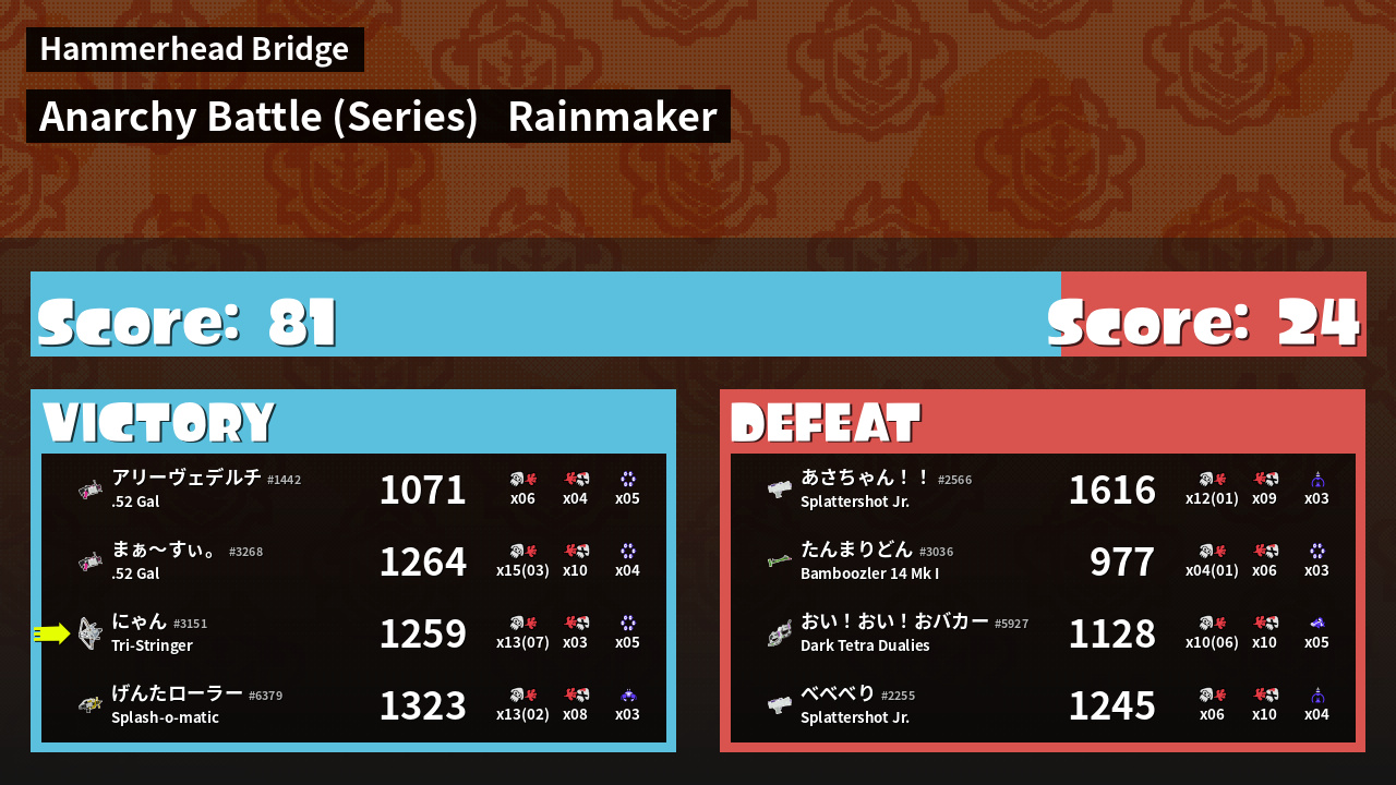 | Medals | #1 Super Jump Spot #1 Splat Assister #2 Overall Splatter | ||