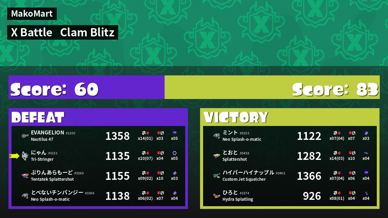 | Mode | Clam Blitz - X Battle | ||