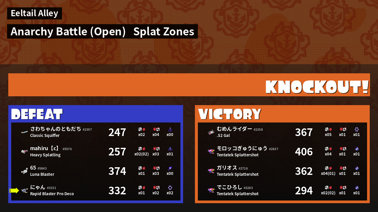 | Mode | Splat Zones - Anarchy Battle (Open) | ||