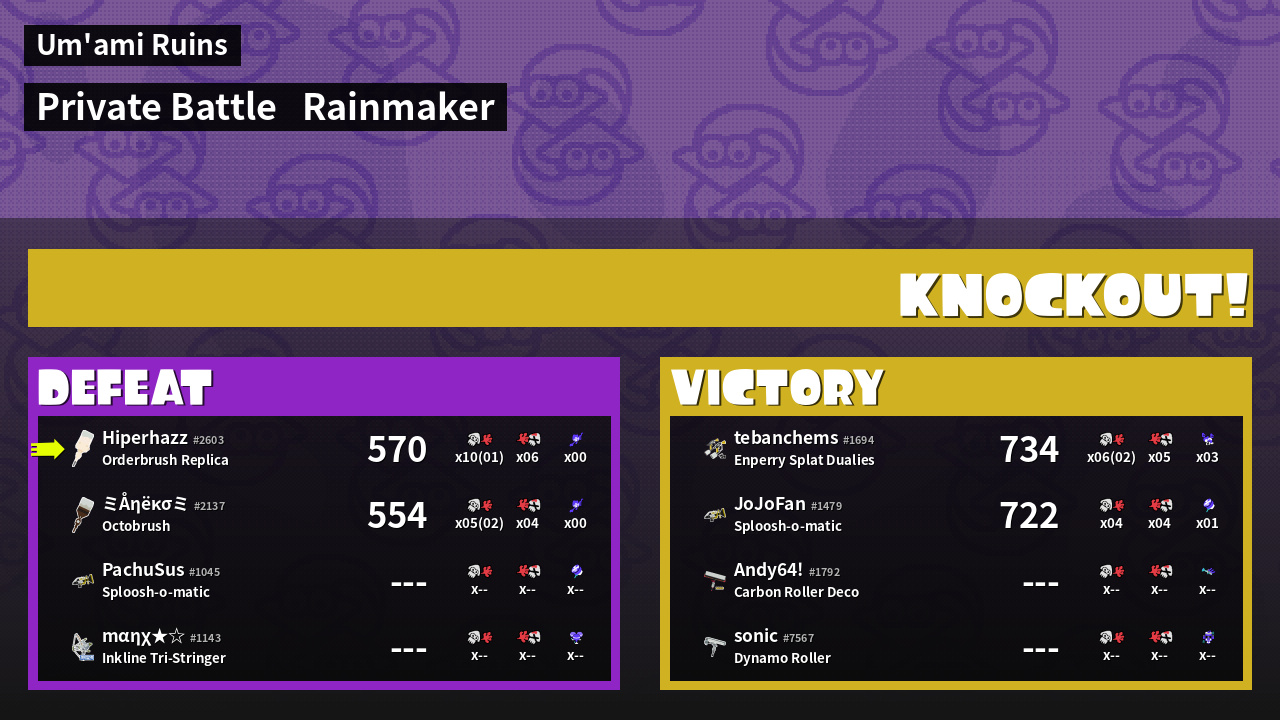| Medals | #1 Overall Splatter #1 Turf Inker #1 Enemy Splatter | ||