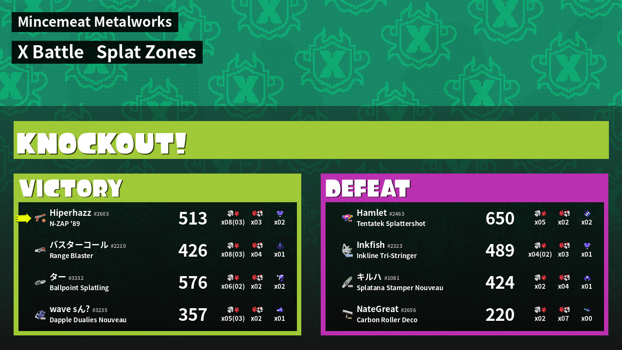 | Medals | #1 Overall Splatter #1 Enemy Splatter #1 Splat Assister | ||