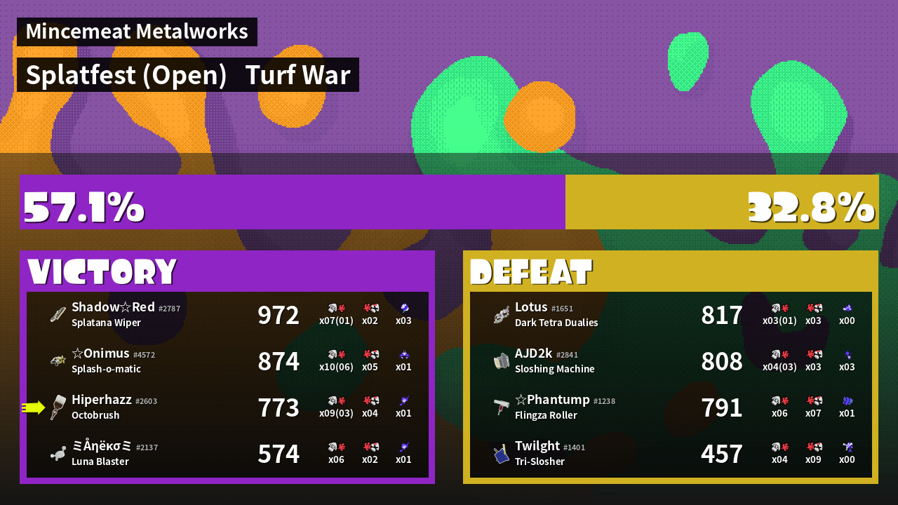 | Medals | #1 Enemy-Base Inker #1 Enemy Splatter #1 Ground Traveler | ||