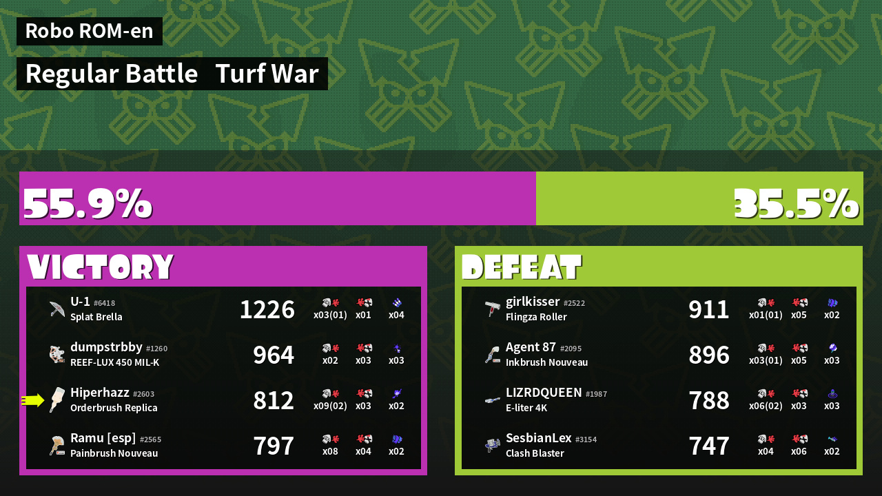 | Medals | #1 Overall Splatter #1 Enemy-Base Inker #1 Splat Assister | ||