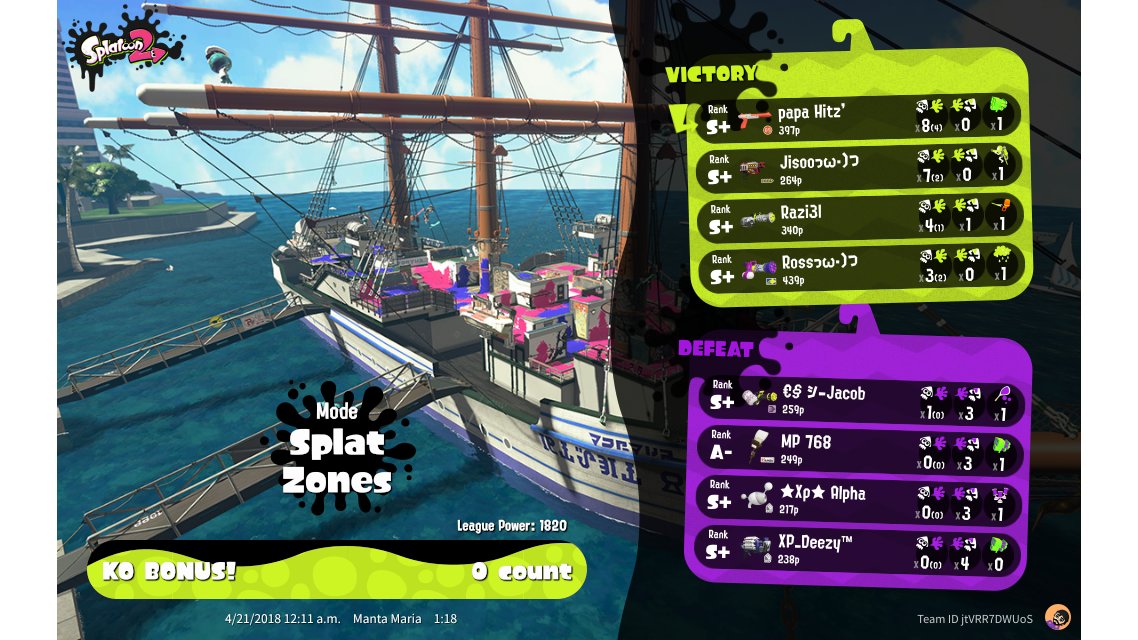 | Mode | Splat Zones - League Battle (Quad) |