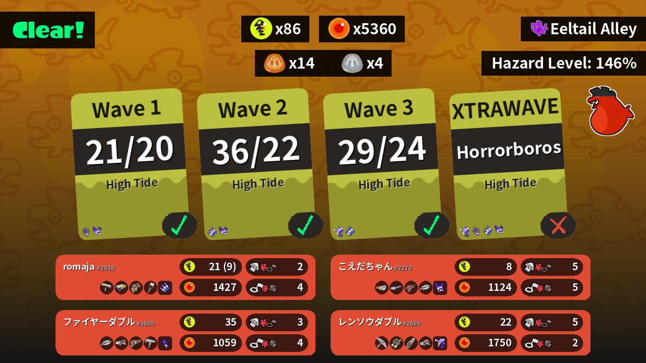 | Weapons | Carbon Roller Splattershot Douser Dualies FF Octobrush | Grizzco Brella Blaster Squeezer Dynamo Roller | Splat Brella Splat Dualies Grizzco Splatana Grizzco Blaster | Goo Tuber E-liter 4K Dualie Squelchers Grizzco Brella |