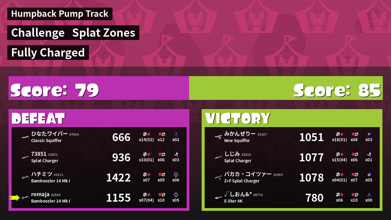 | Medals | #1 Splat Assister #1 Ink Consumer #2 Splat Zone Inker | ||
