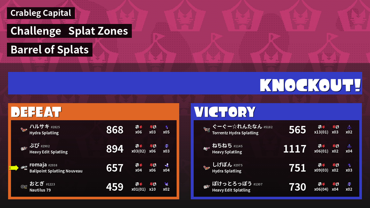 Challenge | Barrel of Splats Muster as much firepower as you can<br />in this battle of the splatlings! | ||