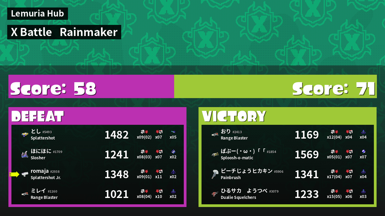 | Medals | #1 Overall Splatter #1 Enemy Splatter #1 Ink Consumer | ||