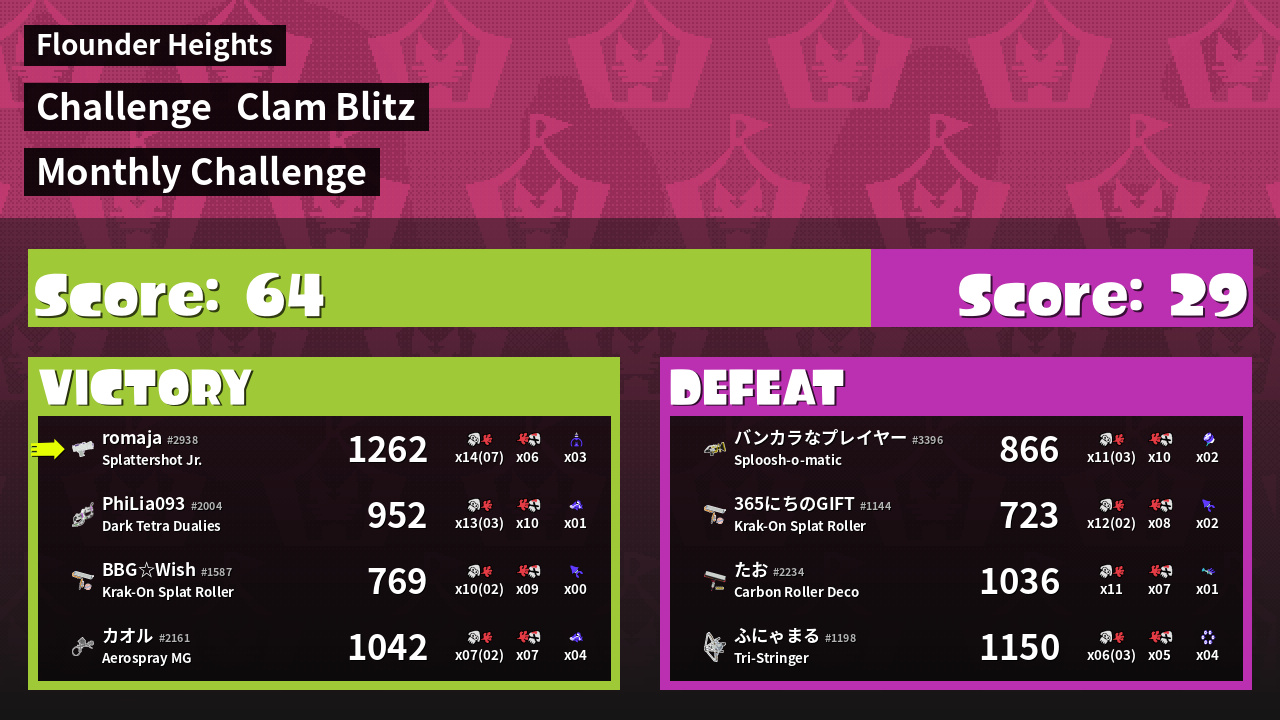 | Medals | #1 Overall Splatter #1 Score Booster #1 Clam Carrier | ||