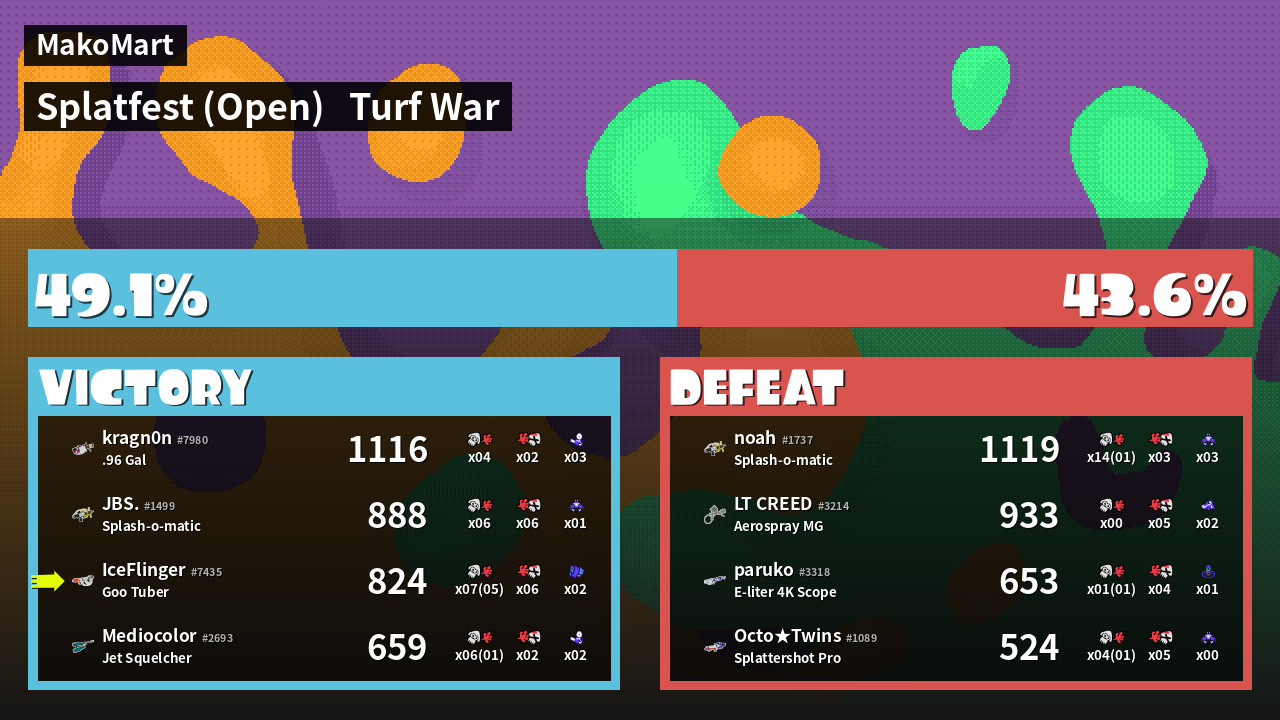 | Medals | #1 Overall Splatter #1 Enemy-Base Inker #1 Splat Assister | ||