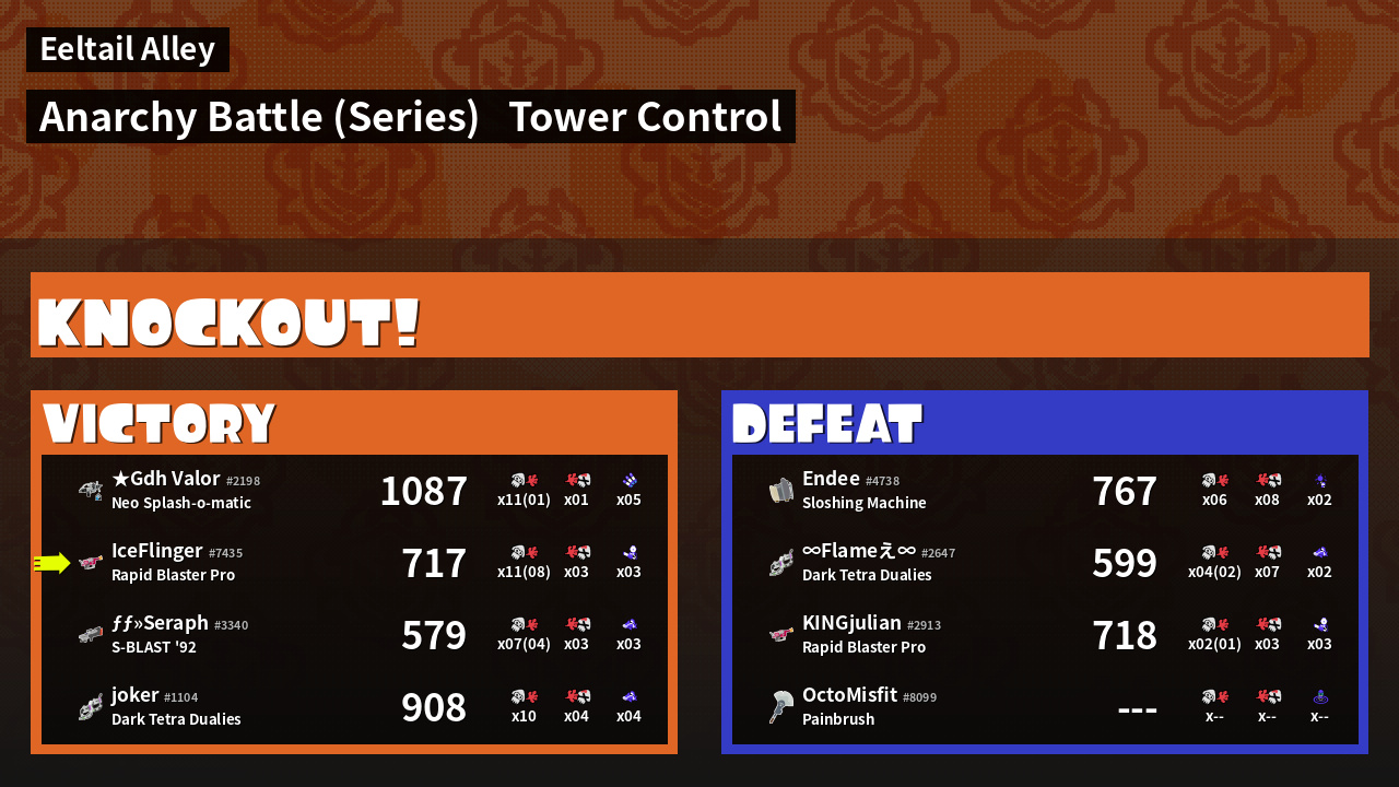 Kills / Deaths | 3 + 8 / 3 = Kill Ratio: 1.00 | ||