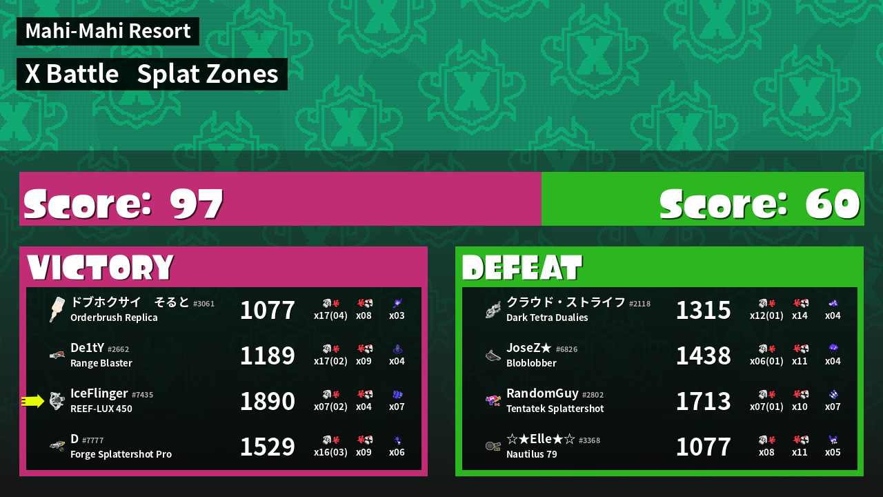 | Medals | #1 Splat Zone Inker #1 Turf Inker #1 Tenta Missiles User | ||