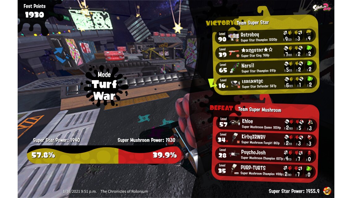 | Mode | Turf War - Splatfest (Pro) | ||||||||||||||||