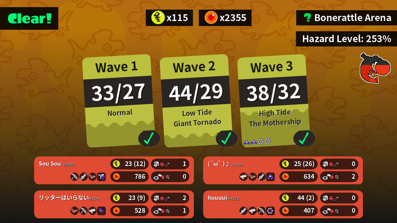| Weapons | Splat Brella Mint Decavitator Hydra Splatling | Mint Decavitator Splattershot Jr. Splat Brella | Splattershot Jr. Hydra Splatling Mint Decavitator | Hydra Splatling Splat Brella Splattershot Jr. |