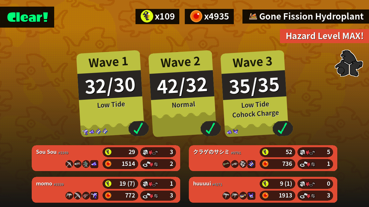 | Weapons | Recycled Brella 24 Mk I Range Blaster Wellstring V | Bamboozler 14 Mk I Grizzco Charger REEF-LUX 450 | Grizzco Roller Splat Brella Dualie Squelchers | Dynamo Roller Grizzco Roller Mini Splatling |