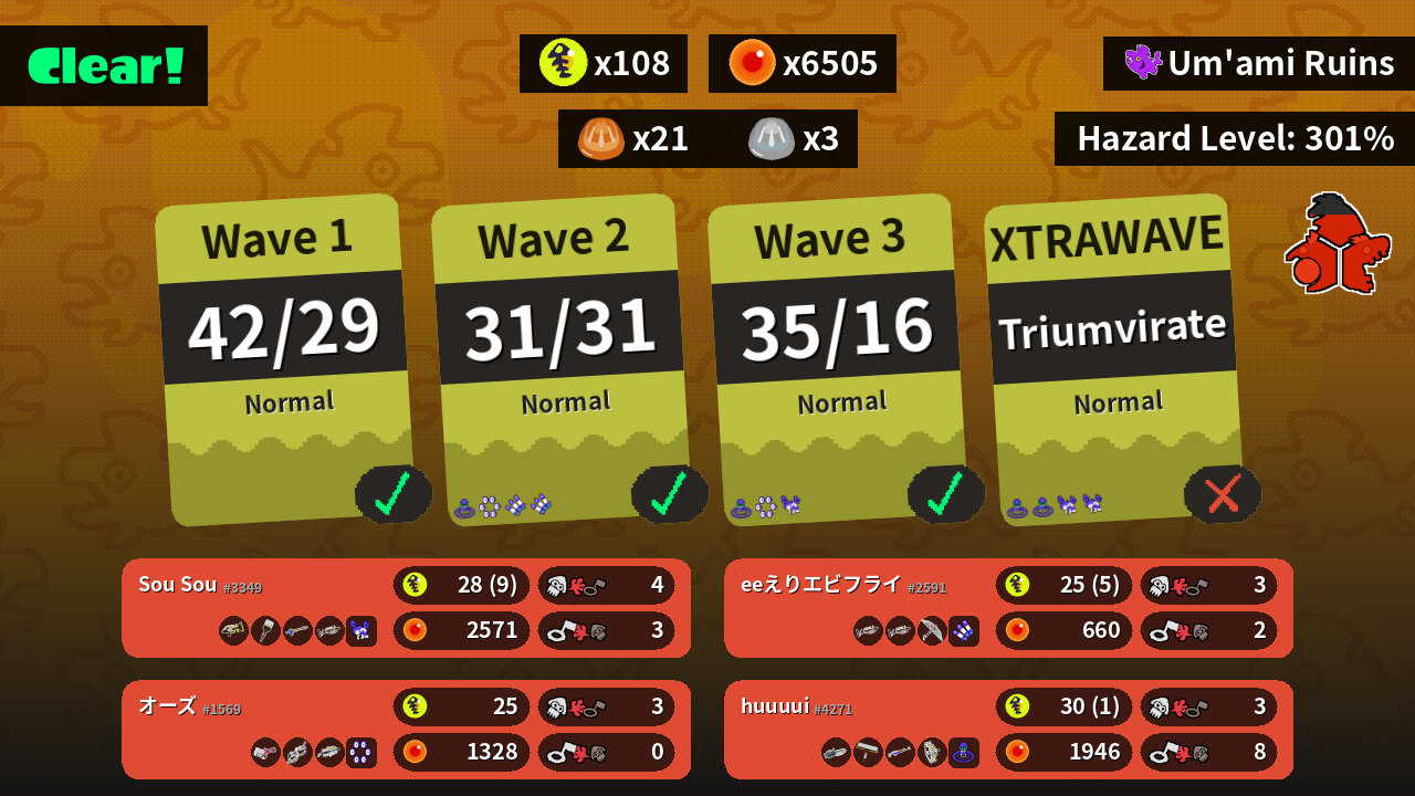 | Weapons | Sploosh-o-matic Octobrush Snipewriter 5H Grizzco Charger | Ballpoint Splatling Carbon Roller Splat Charger Grizzco Stringer | Heavy Splatling Dark Tetra Dualies Grizzco Brella ? | Grizzco Charger Grizzco Charger Splat Brella ? |