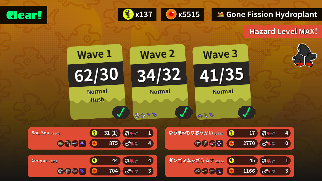 | Weapons | Dread Wringer Tenta Brella Classic Squiffer | Grizzco Blaster Splat Charger N-ZAP '85 | REEF-LUX 450 Douser Dualies FF Hydra Splatling | Grizzco Roller Octobrush Rapid Blaster Pro |