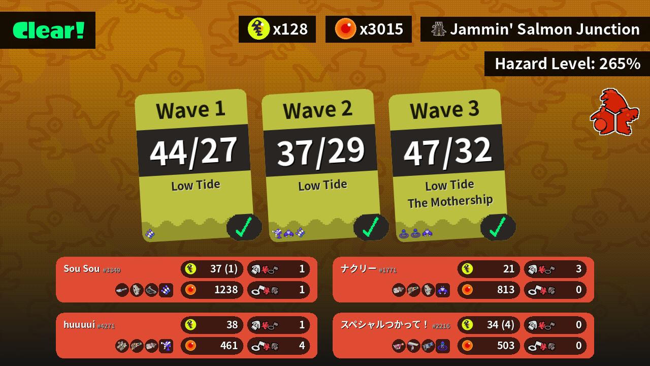 | Weapons | E-liter 4K Grizzco Stringer Bloblobber | Grizzco Dualies Squeezer Heavy Edit Splatling | Rapid Blaster Pro Splat Roller L-3 Nozzlenose | Heavy Edit Splatling Squeezer Grizzco Stringer |