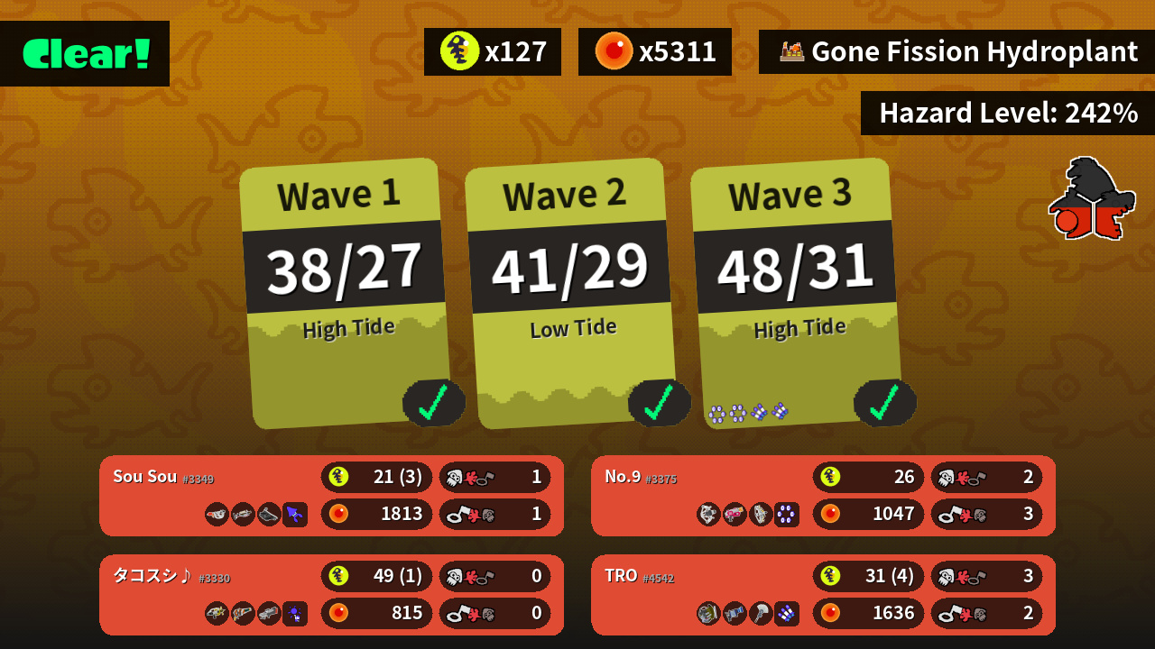 | Weapons | Goo Tuber Grizzco Charger Bloblobber | Splash-o-matic Squeezer S-BLAST '92 | Grizzco Slosher L-3 Nozzlenose Painbrush | REEF-LUX 450 Rapid Blaster Grizzco Stringer |