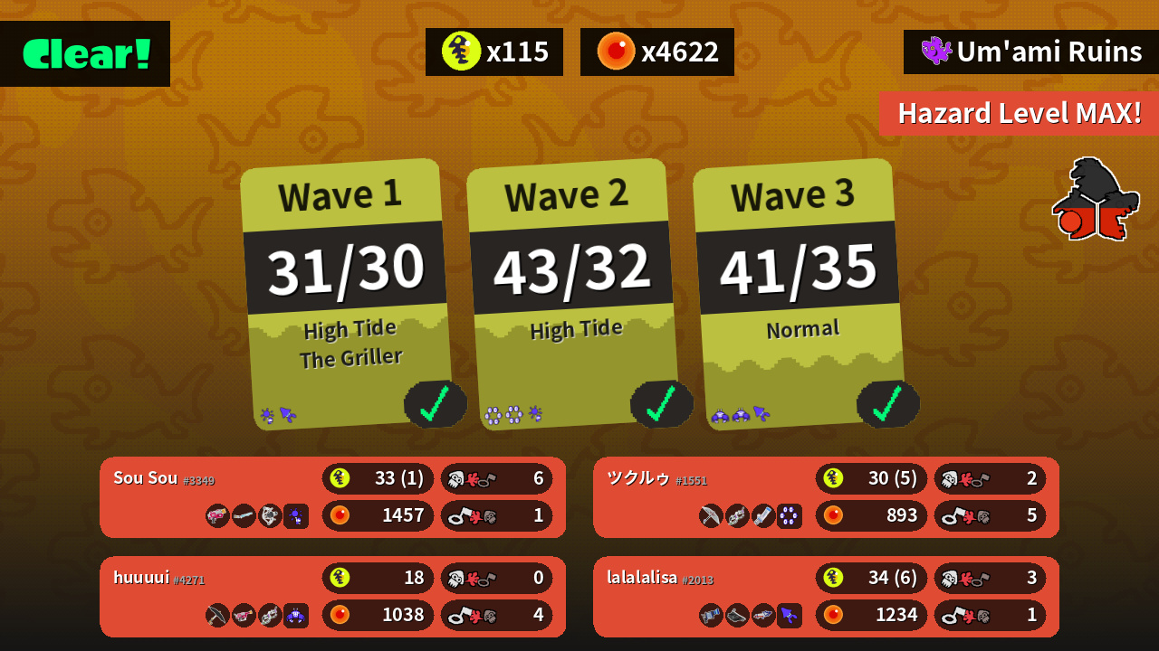 | Weapons | Rapid Blaster Classic Squiffer REEF-LUX 450 | L-3 Nozzlenose Bloblobber Splattershot Pro | Splat Brella Dark Tetra Dualies Mint Decavitator | Undercover Brella Rapid Blaster Pro Dark Tetra Dualies |