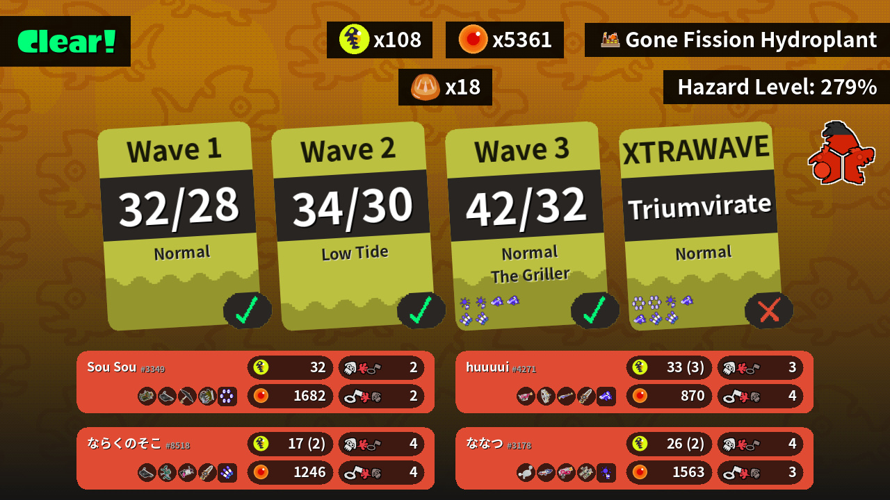 | Weapons | Explosher Bloblobber Undercover Brella Grizzco Slosher | Rapid Blaster Pro Grizzco Stringer Splat Charger Grizzco Splatana | Luna Blaster Splattershot Pro Rapid Blaster Grizzco Dualies | Bloblobber Wellstring V .52 Gal Grizzco Splatana |